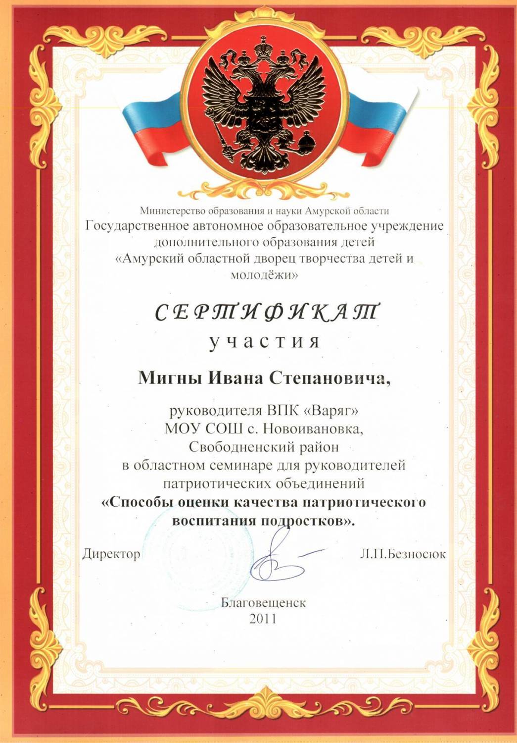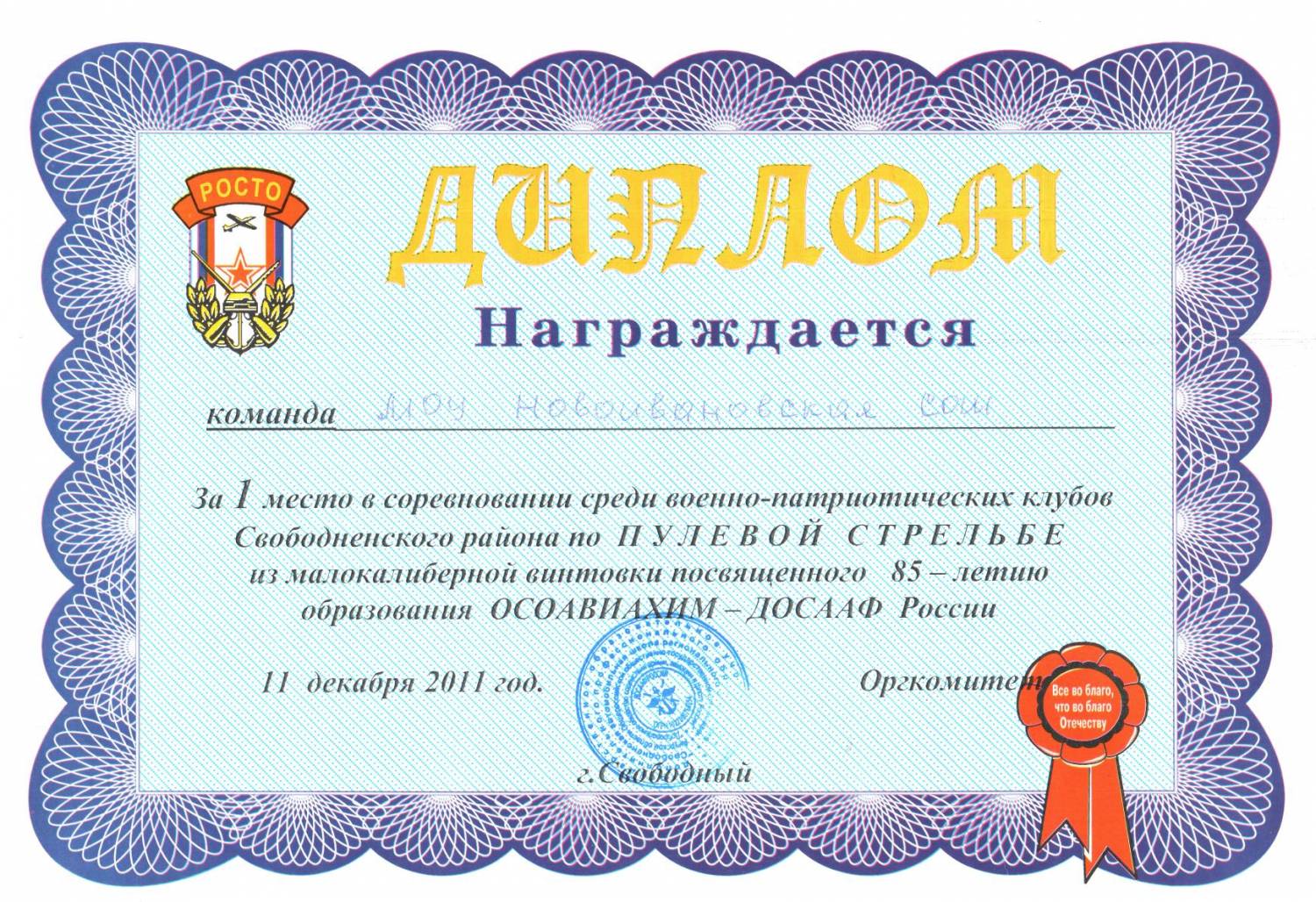 Диплом за первое место в соревновании среди ВПК Свободненского района по пулевой стрельбе из малокалиберной винтовки посвященного 85-летию образования ОСОАВИАХИМ-ДОССАФ России 11.12.2011.