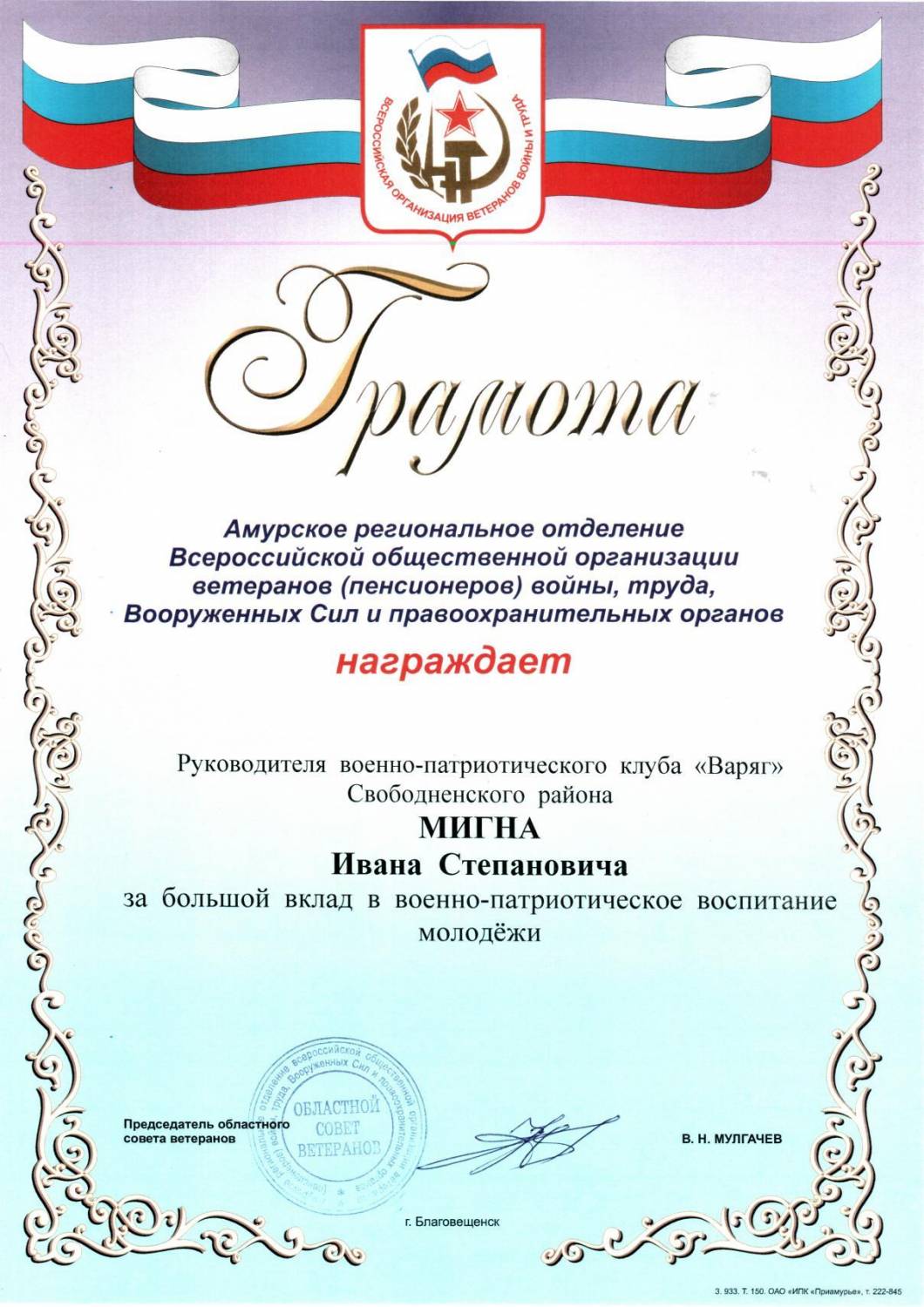 Награждение за большой вклад в военно-патриотическое воспитание молодежи.